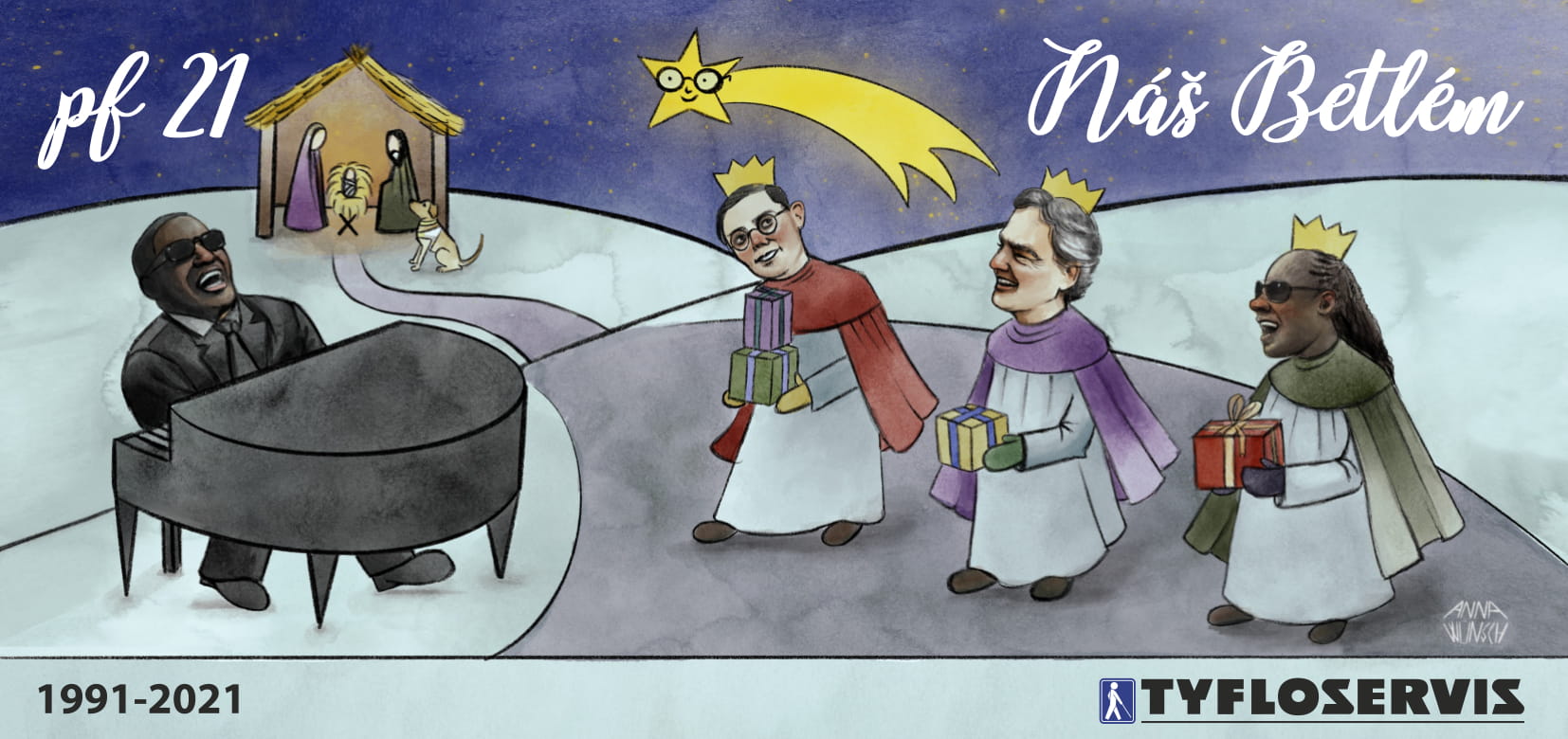 Na noční obloze plné hvězd září usměvavá kometa se silnými dioptrickými brýlemi na nose. Nad zasněženými kopci je ozdobným písmem napsáno: „Náš Betlém“. Na horizontu, pod skromným přístřeškem, žije svatá rodina – Marie, Josef a novorozené děťátko. Před vchodem čeká vodicí pes. Po cestě kráčí Tři králové a přinášejí Ježíškovi své dárky. Vede je Jaroslav Ježek. Se zpěvem na rtech ho následuje Andrea Bocelli a vzadu Stevie Wonder. Za klavírem sedí a hrou i svým mocným hlasem jejich putování doprovází Ray Charles. Letopočet 1991 až 2021 připomíná, kdy projekt Tyfloservis vznikl a jak dlouho poskytuje nevidomým a slabozrakým lidem terénní a ambulantní služby.